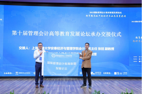 上海交通大学安泰经济与管理学院会计系主任张括副教授与贵州财经大学会计学院院长杜剑教授共同完成发展论坛承办单位交接仪式。2024国际管理会计教育联盟发展论坛将由贵州财经大学承办。